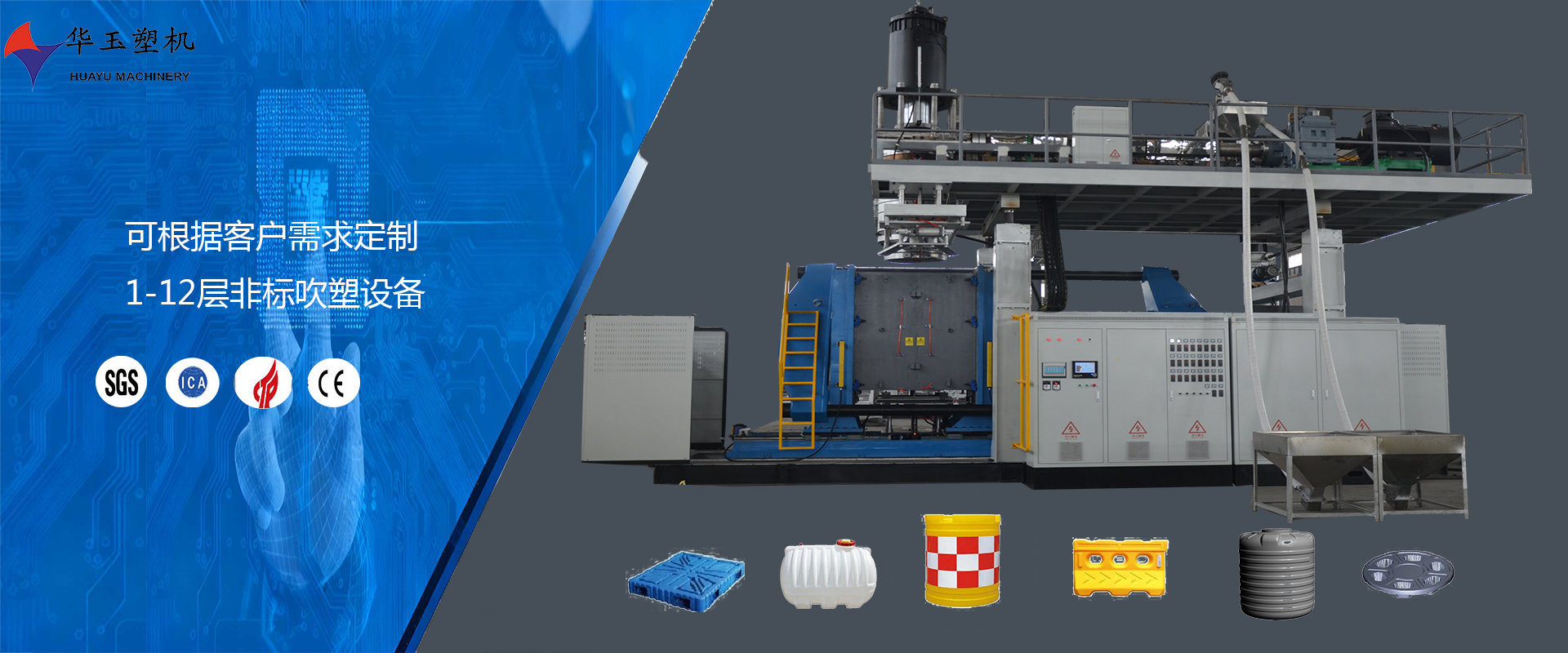 濰坊市華玉塑料機(jī)械有限公司創(chuàng)辦于貳零零貳年,是超大型全自動(dòng)中空吹塑設(shè)備專(zhuān)業(yè)生產(chǎn)廠家。公司融合國(guó)內(nèi)外先進(jìn)技術(shù)和理念,專(zhuān)業(yè)設(shè)計(jì)、生產(chǎn)、銷(xiāo)售一層到十層的大型全自動(dòng)中空成型機(jī)組。我公司生產(chǎn)的各型號(hào)吹塑機(jī)可生產(chǎn)50升到30,000升的各類(lèi)塑料水桶,噸桶、雙環(huán)桶、水馬、路錐、隔離墻托盤(pán)、桌板、浮筒、皮劃艇、工具箱包等中空制品。優(yōu)良的品質(zhì)、穩(wěn)定的性能、優(yōu)越的性價(jià)比使公司產(chǎn)品不僅暢銷(xiāo)國(guó)內(nèi)市場(chǎng),并出口到亞洲、東南亞、中東、歐洲、北美、南美、非洲等80多個(gè)國(guó)家和地區(qū),深受客戶的好評(píng)...
